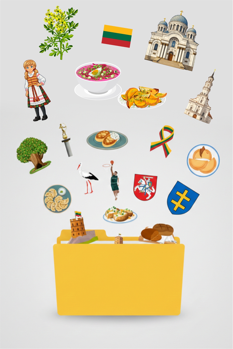• Lietuvos simboliai: ąžuolas, gandras, krepšinis, tautiniai rūbai.