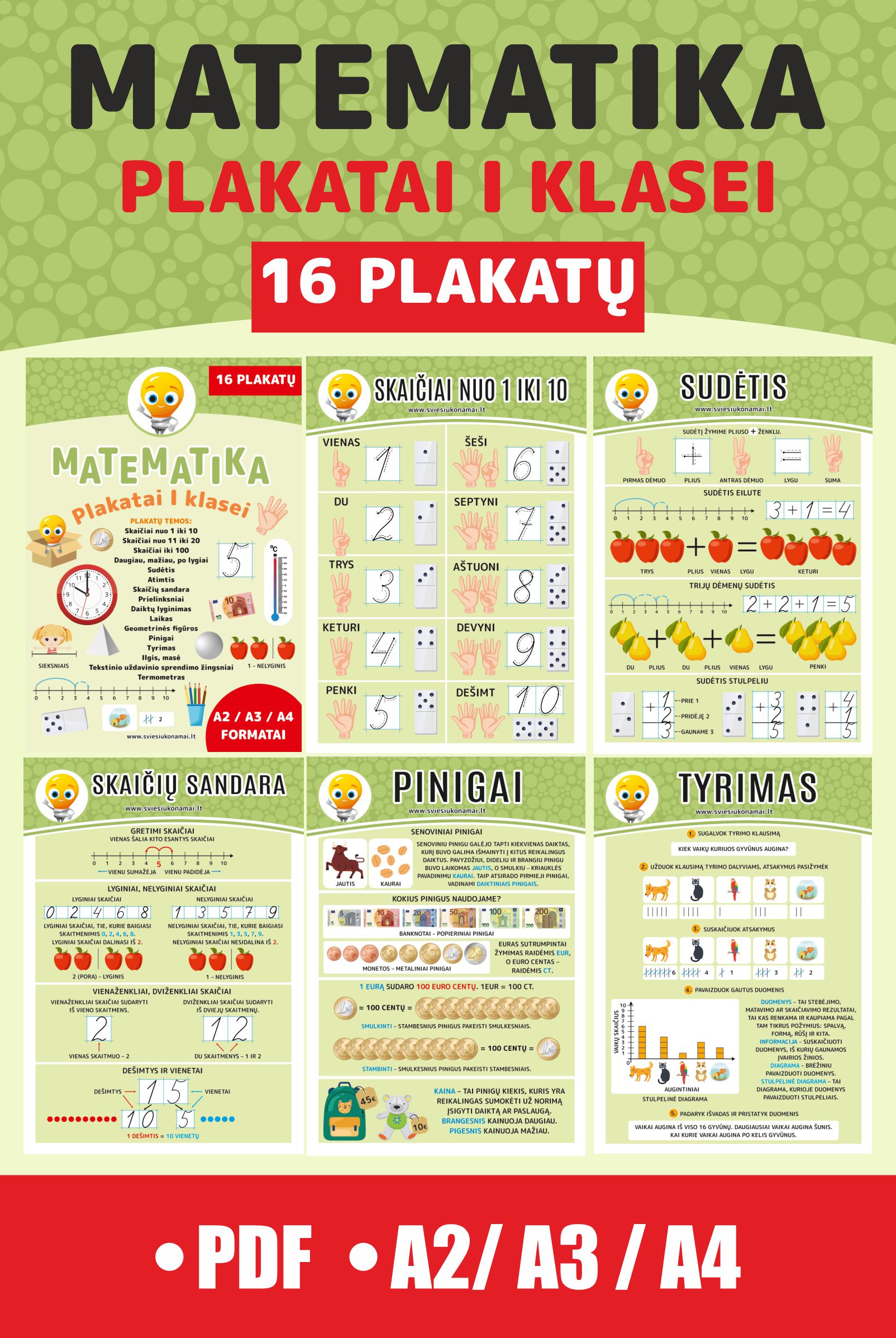 Ši iliustruota vaizdinė mokomoji priemonė tiks ir priešmokyklinukams, ir pirmokams. Plakatai padės mokiniams suvokti matematinę kalbą, įsiminti terminus, spręsti uždavinius. Tai puiki demonstravimo priemonė ne tik mokytojui, bet ir naudojimui namuose.
