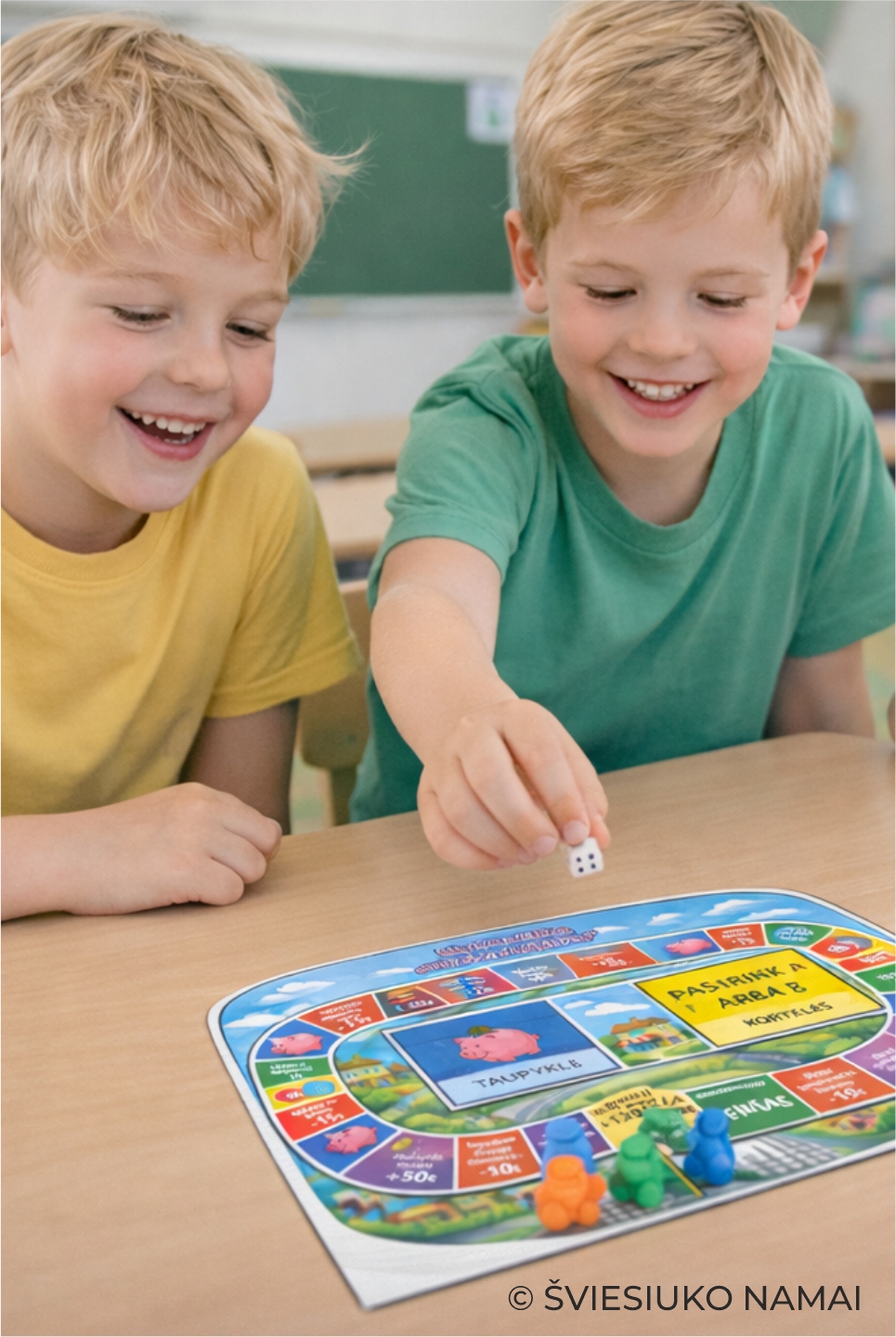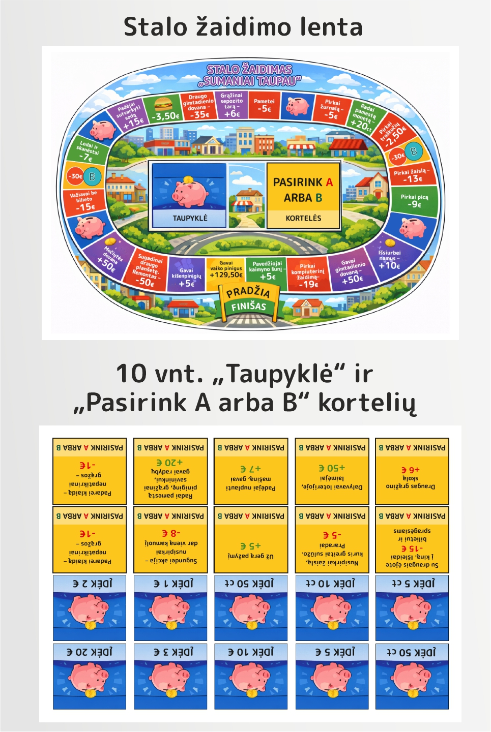 Stalo žaidimas „Sumaniai taupau“ – tai edukacinis stalo žaidimas vaikams, skirtas mokytis finansinio raštingumo per praktiką. Žaisdami vaikai mokosi pažinti eurus ir centus, skaičiuoti pinigus, suprasti pinigų vertę, priimti sprendimus – leisti ar taupyti – bei planuoti savo finansus.