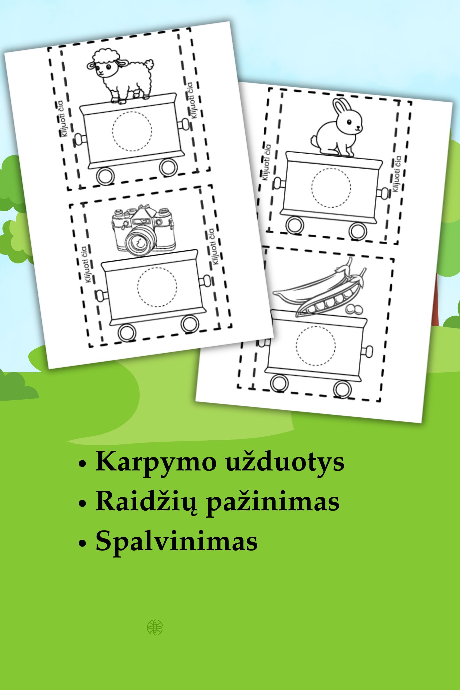 - karpymo, spalvinimo ir raidžių pažinimo užduotis;