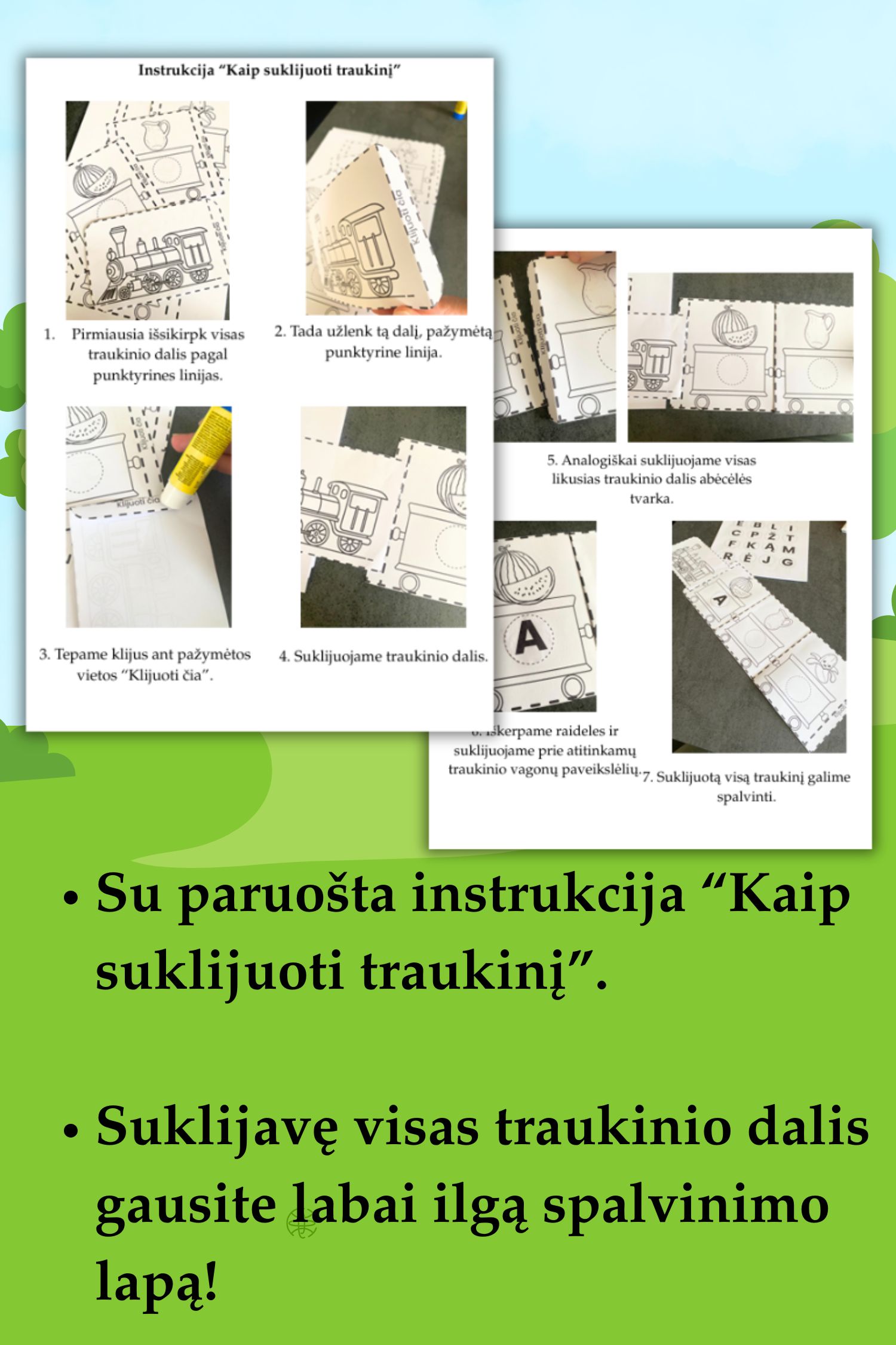 - aiškią instrukciją „Kaip suklijuoti traukinį“;