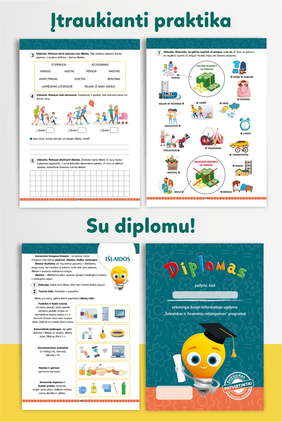 Šis užduočių sąsiuvinis padės perprasti paprasčiausius finansinius procesus ir ugdys racionalaus elgesio su pinigais įpročius, padės vaikams įgyti finansinio raštingumo pradmenų visumą: susipažinti su pinigų atsiradimo istorija, banknotais ir monetomis (vertė, nauda), lavinti skaičiavimo įgūdžius naudojant pinigus, atpažinti skirtumą tarp norų ir poreikių, suprasti, kodėl žmonės dirba ir gauna uždarbį, ugdyti taupymo įgūdžius ir suprasti taupymo prasmę, suvokti, kas yra paskola ir kad ją būtina grąžinti.