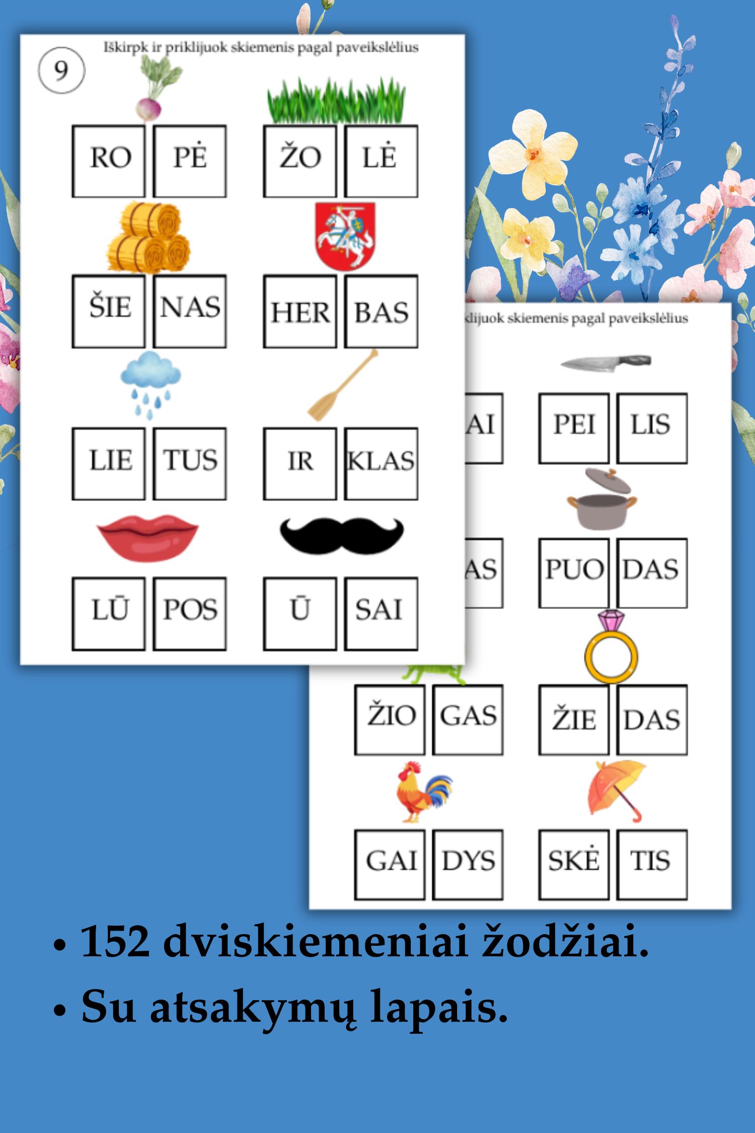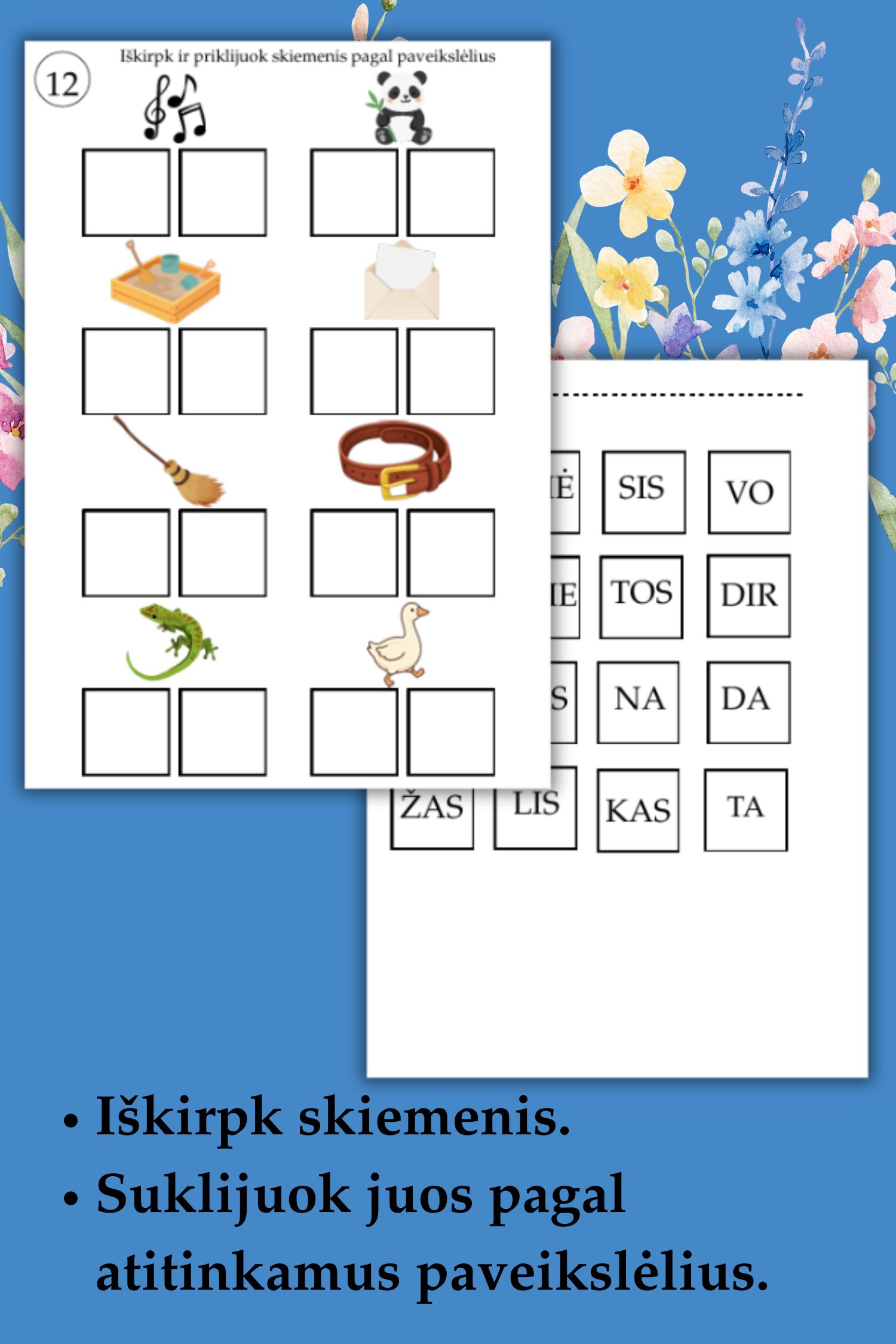 Galima rašyti skiemenis ranka į tuščius langelius. Skiemenis galima laminuoti ir naudoti daug kartų.